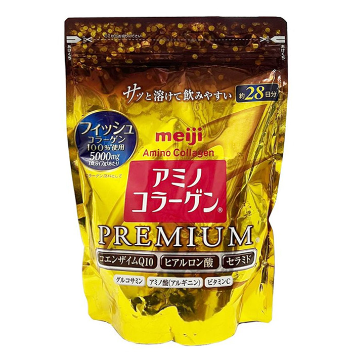 - Với hàm lượng collagen đến 5000mg, Bột Collagen Meiji Premium, 214g, Dạng túi có tác dụng bổ sung lượng collagen cần thiết cho da, giúp kết nối các tế bào da lại với nhau, kích thích quá trình trao đổi chất và tái tạo da, duy trì độ đàn hồi của da, giữ cho làn da luôn căn mịn, tươi trẻ