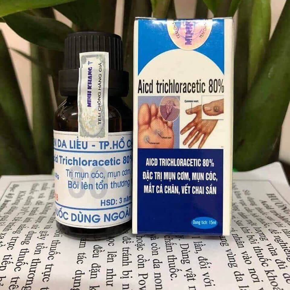 - Acid Trichloracetic 80% tiêu diệt vi khuẩn, cho hiệu quả trị mụn cơm, mụn cóc hiệu quả sau 3-5 lần chấm thuốc. (Mụn khô lại và bong vảy)