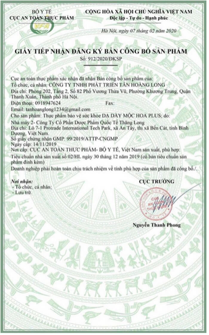 Chúng tôi cung cấp Dạ dày Mộc Hoa CHÍNH HÃNG, nhập trực tiếp tư công ty sản xuất. Chúng tôi cam kết hoàn tiền 300% nếu bạn phát hiện hàng giả hàng nhái từ chúng tôi.