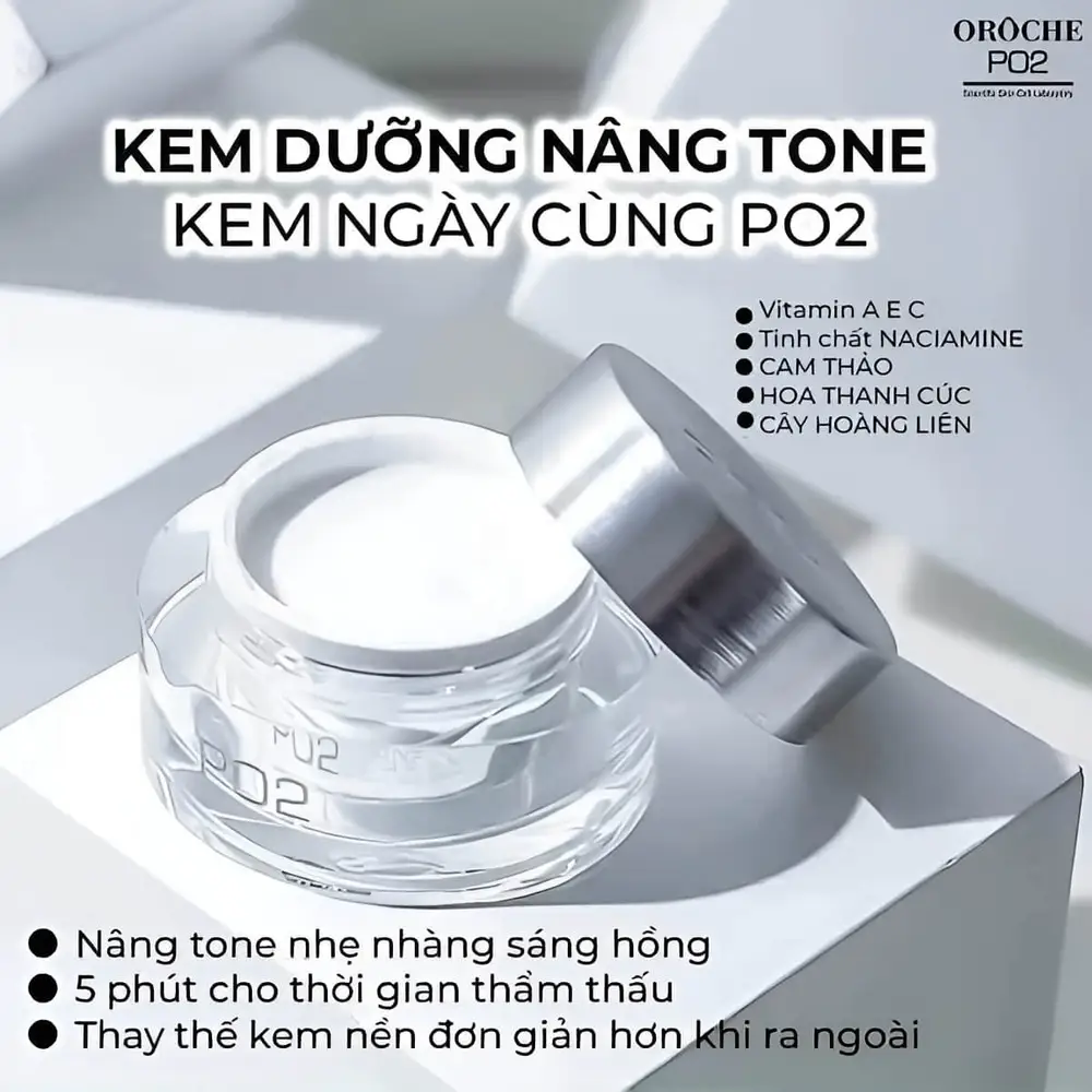 Orôche Po2 Tone Up Cream là kem váng sữa từ Hàn Quốc, thiết kế để nâng tông da nhẹ nhàng và làm sáng da tức thì. Sản phẩm và Kem PO2 bán ở đâu cũng được phân phối rộng rãi qua nhà phân phối chính hãng. Với kết cấu nhẹ, dịu nhẹ cho da, kem phù hợp cho cả da mặt và body, giúp tạo hiệu ứng da tươi sáng, mịn mà không nhờn rít.