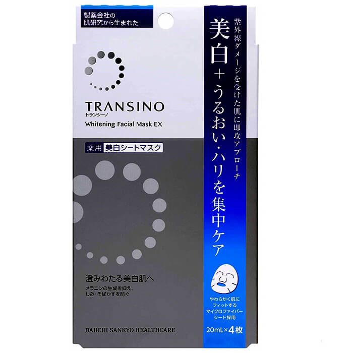 - Mặt nạ Transino whitening facial EX Nhật Bản hộp 4 miếng x 20ml là sản phẩm dưỡng da dạng mặt nạ giấy rất tiện dụng và rất “thần thánh”.