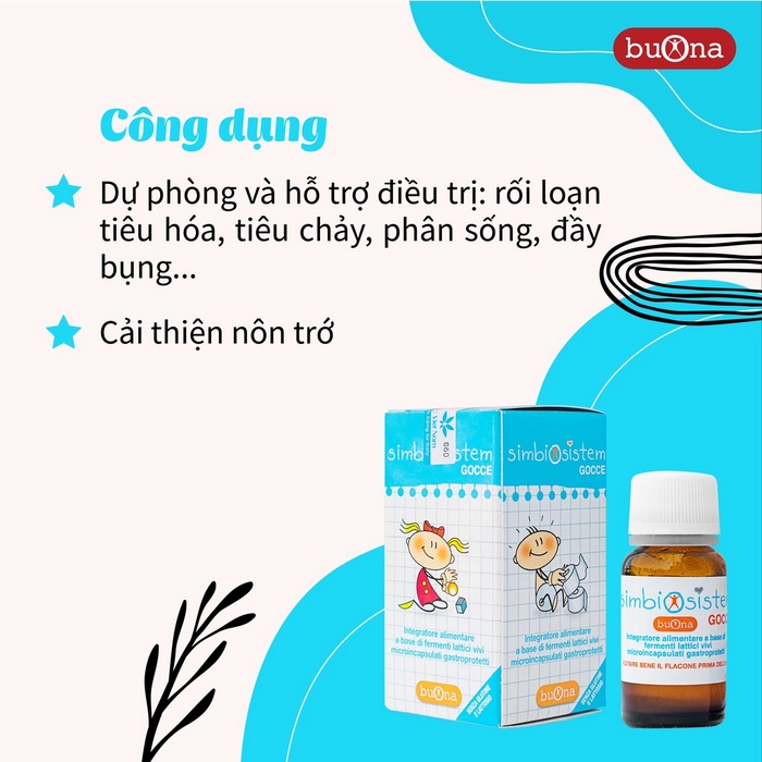 - Men vi sinh Buona Simbiosistem bổ sung lợi khuẩn sống với các loại như L. rhamnosus và L. reuteri giúp cân bằng hệ vi sinh đường ruột.