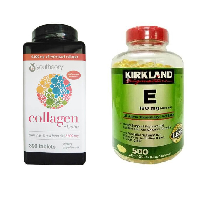 - Bộ đôi chống lão hóa da gồm viên uống cung cấp collagen và vitamin E.Viên uống Collagen Youtheory giúp làm mờ nám, tàn nhang, tăng độ bóng và sáng cho làn da, tăng khả năng liên kết mô, hỗ trợ cải thiện độ đàn hồi cho da giúp da săn chắc, căng mọng. Còn Vitamin E 400 IU Kirkland cung cấp vitamin E cho cơ thể giúp cho bạn có làn da mịn màng, trắng hồng, ngăn ngừa quá trình lão hóa của làn da.