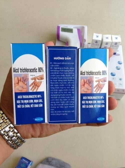 - Acid Trichloracetic 80% tiêu diệt vi khuẩn, cho hiệu quả trị mụn cơm, mụn cóc hiệu quả sau 3-5 lần chấm thuốc. (Mụn khô lại và bong vảy)