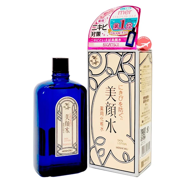 Lotion trị mụn Meishoku Bigansui Medicated Skin có thiết kế đẹp, chai màu xanh sang trọng và trông bắt mắt. Meishoku được biết đến nhờ vào tính năng trị mụn vượt trội.