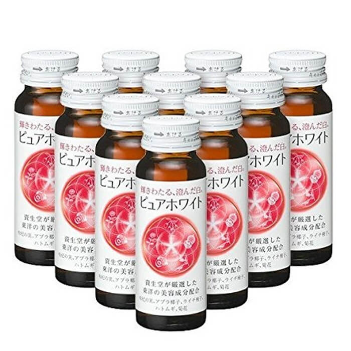 - Nước uống trắng da toàn thân Pure White Shiseido của Nhật Bản chứa Vitamin C, da cá dưới biển sâu, vitamin P, Vitamin A, giúp da trắng mịn, đàn hồi tốt, và trẻ hóa làn da.