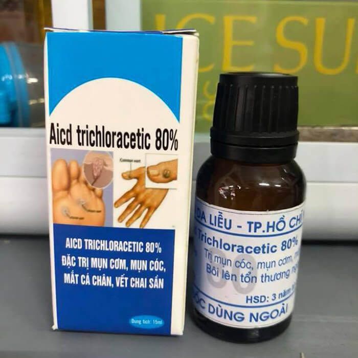 - Acid Trichloracetic 80% tiêu diệt vi khuẩn, cho hiệu quả trị mụn cơm, mụn cóc hiệu quả sau 3-5 lần chấm thuốc. (Mụn khô lại và bong vảy)