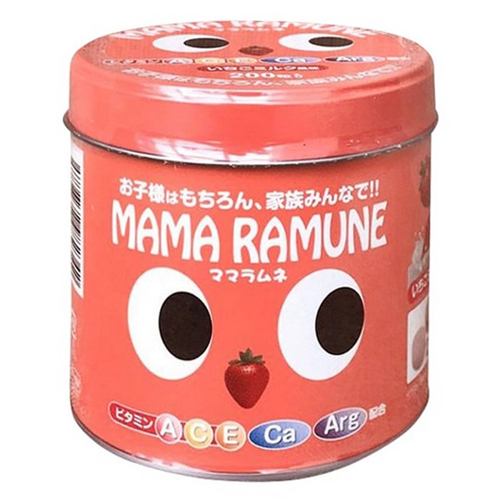 Kẹo cho trẻ biếng ăn Mama Ramune hương vị dâu ngon, bổ sung các vitamin, khoáng chất, canxi giúp tăng cường đề kháng, làm giảm nguy cơ đau ốm, thúc đẩy phát triển xương và răng,..