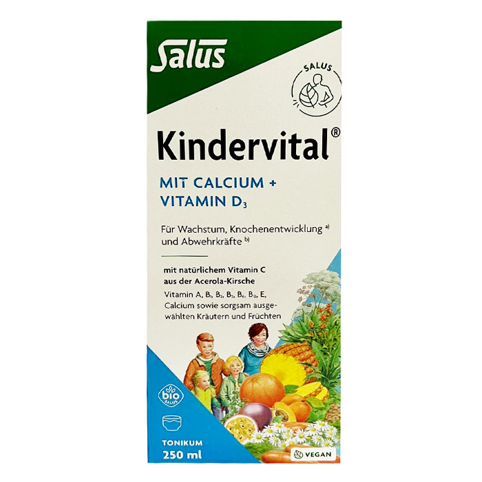 Siro Salus Floradix Kindervital Bổ Sung Canxi & Vitamin bổ sung canxi, vitamin D3 cùng các khoáng chất khác. Giúp bé phát triển chiều cao toàn diện, xương chắc khỏe. Phòng chống tình trạng còi xương, đổ mồ hôi trộm, quấy khóc nửa đêm