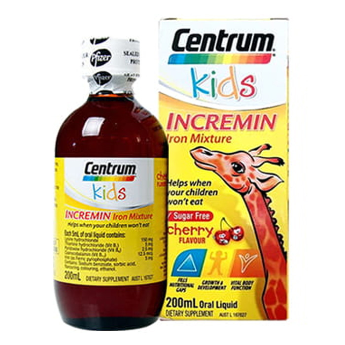 - Centrum Kids Incremin Iron Mixture là vitamin nổi tiếng của Úc, bổ sung lysin, vitamin nhóm B và sắt dành riêng cho bé biếng ăn, kém hấp thu.Hương vị trái cây thơm ngon, dễ uống.