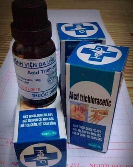 - Acid Trichloracetic 80% tiêu diệt vi khuẩn, cho hiệu quả trị mụn cơm, mụn cóc hiệu quả sau 3-5 lần chấm thuốc. (Mụn khô lại và bong vảy)