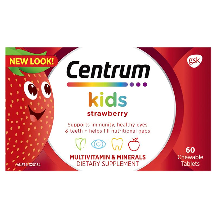 - Vitamin tổng hợp cho trẻ em Centrum Kids Strawberry dạng viên nhai hương vị dâu ngon, bé nào cũng thích. Sản phẩm chứa 18 loại vitamin và khoáng chất thiết yếu, để tăng cường đề kháng, hỗ trợ răng chắc khỏe, bổ mắt, tăng năng lượng, cho bé hoạt động suốt cả ngày. Sản phẩm dành cho trẻ em tư 3 tuổi.