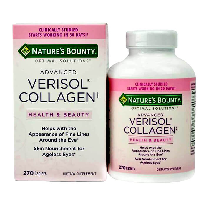 - Viên uống Nature’s Bounty Advanced Verisol Collagen được chiết xuất từ các thành phần thiên nhiên, chứa chất chống oxy hóa như vitamin C, một trong những chất chống oxy hóa tốt nhất để chống lại các gốc tự do và vitamin E, một chất chống oxy hóa mạnh giúp cải thiện chức năng trao đổi chất chống lại các gốc tự do và stress oxy hóa với công thức tối ưu bổ sung collagen tăng tính đàn hồi, chống lại các nếp nhăn xấu xí ở mắt giúp bạn luôn tươi trẻ, tự tin.