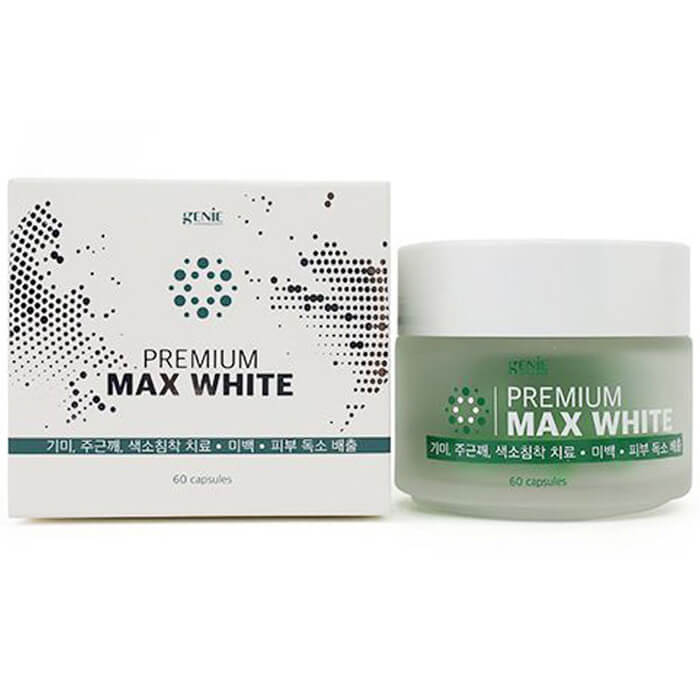 - Viên uống trắng da Premium Max White Genie làm bật tông da, xóa mờ vết thâm nám, tàn nhang, đốm nâu, giúp toàn thân trắng hồng rạng rỡ. Ngoài ra, Vitamin C, B3, E, A, glutathione, collagen, tế bào gốc nhau thai ngựa và thành phần thiên nhiên còn giúp cân bằng nội tiết, ngăn chặn lão hóa và hỗ trợ sức khỏe.