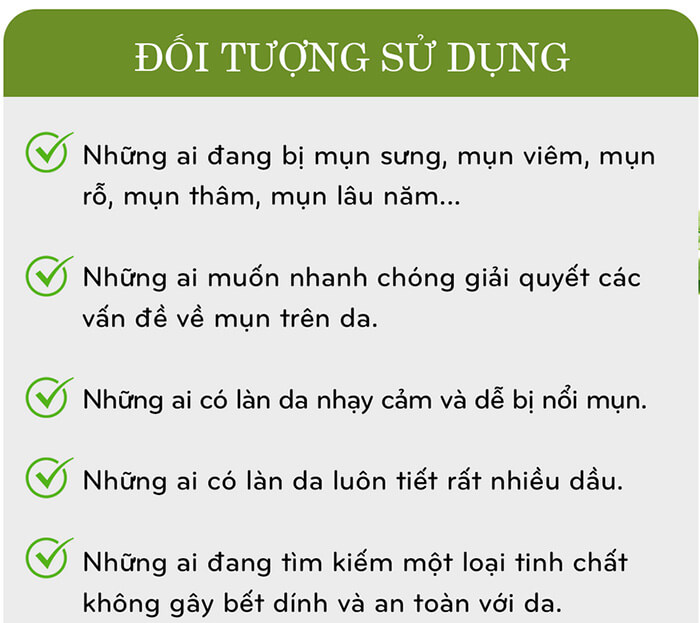 • Mới bị mụn hoặc bị mụn lâu năm, mụn do thay đổi nội tiết tố giai đoạn dậy thì, sau sinh, dị ứng mỹ phẩm, thời tiết...