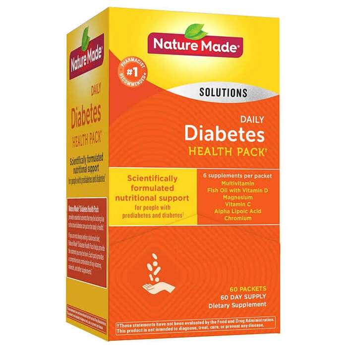 - Chăm sóc sức khỏe cho bệnh nhân tiểu đường cung cấp các dưỡng chất quan trọng có khả năng bị thiếu hụt khi mắc phải căn bệnh này. Mỗi gói Điều Hòa Tiểu Đường Nature Made Diabetes Health Pack là một sự kết hợp hoàn chỉnh của các loại vitamin, khoáng chất và axit alpha lipoic.