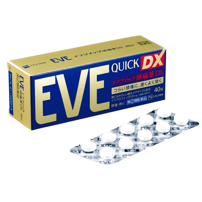 - Viên uống giảm đau, hạ sốt Eve Quick DX chuyên trị dứt các cơn đau đầu, đau bụng hành kinh, đau khớp, các chấn thương…một cách nhanh chóng và an toàn nhất. Là sản phẩm lưu hành nội địa Nhật Bản, được sản xuất dành riêng cho người dân sử dụng, chất lượng đảm bảo đạt chuẩn của sở y tế. Eve Quick DX có chứa hàm lượng Ibuprofen kết hợp Allylisopropylacetylurea nâng cao hiệu quả an thần, đồng thời hỗ trợ lưu thông máu huyết toàn cơ thể lấy lại trạng thái cân bằng, làm dịu thần kinh.