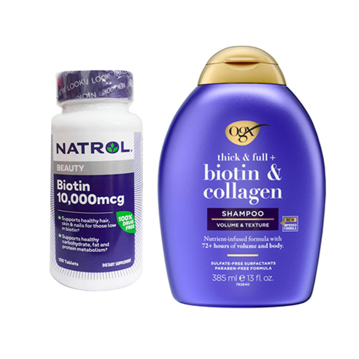 - Bộ đôi mọc tóc Biotin và Dầu gội Biotin & Collagen OGX chứa Biotin hay còn gọi là Vitamin H hay Vitamin B7 là một loại Vitamin cần thiết đồng thời là chất dinh dưỡng quan trọng trong quá trình phát triển và nuôi dưỡng giúp cho làn da, móng tay và mái tóc được khỏe mạnh.