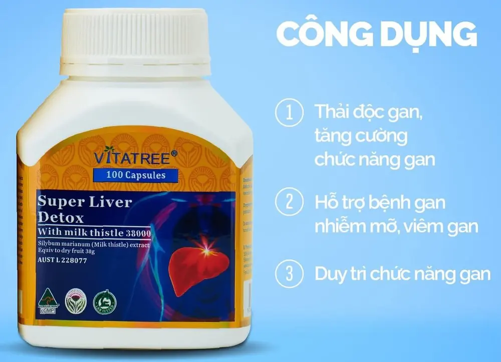 Viên bổ gan Vitatree thải độc gan là dòng thực phẩm bổ sung nhập khẩu từ Úc, chứa chiết xuất Milk Thistle (cây kế sữa) nổi tiếng trong việc hỗ trợ gan khỏe mạnh. Với hàm lượng chuẩn 38000mg, sản phẩm giúp tăng cường chức năng gan, hỗ trợ đào thải độc tố và giảm ảnh hưởng từ rượu bia hay thói quen sinh hoạt thiếu lành mạnh.