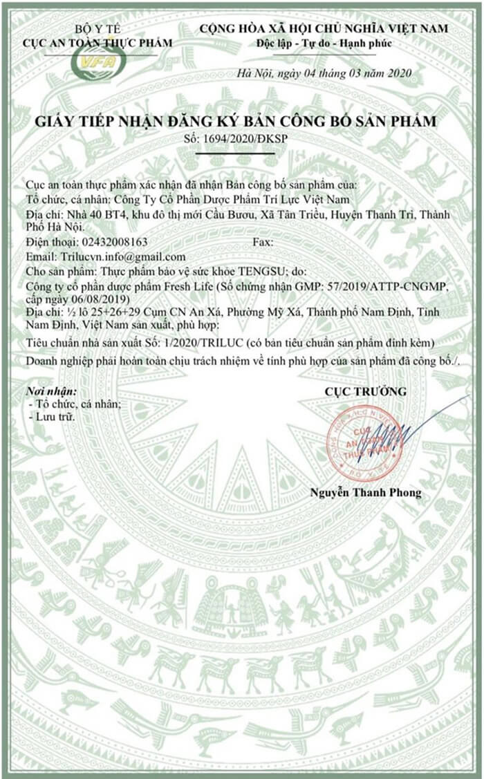 Giấy chứng nhận chất lượng sản phẩm của Bộ Y Tế cấp cho viên ngậm Tengsu