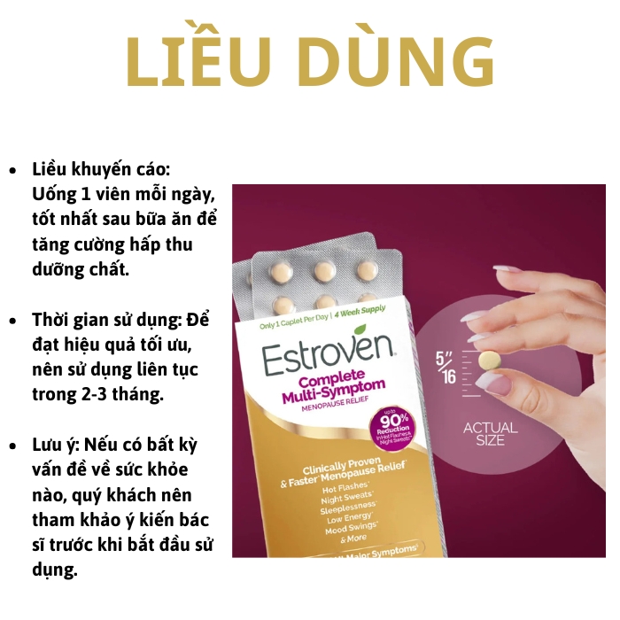 Liều dùng khuyến cáo của Estroven Complete là 1 viên mỗi ngày, uống sau bữa ăn để tăng cường hấp thu dưỡng chất. Đây là liều lượng được thiết kế dựa trên nghiên cứu và phản hồi của người tiêu dùng. Luôn tuân thủ hướng dẫn sử dụng để đảm bảo an toàn và đạt hiệu quả cao nhất.