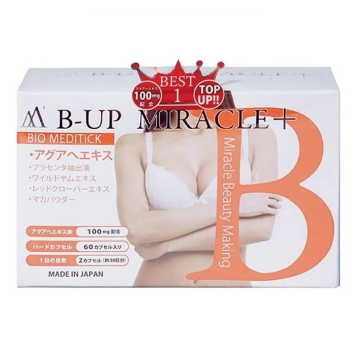 - Viên uống nở ngực, mông B-Up Miracle + được bộ Y tế Nhật cấp phép lưu thông trên thị trường. Công thức độc đáo với chiết xuất Aguaje, tinh chất nhau thai, cây tỳ giải,... Đặc biệt, sản phẩm còn hỗ trợ sức khỏe. Làm đẹp da chống lão hóa, không gây tác dụng phụ.