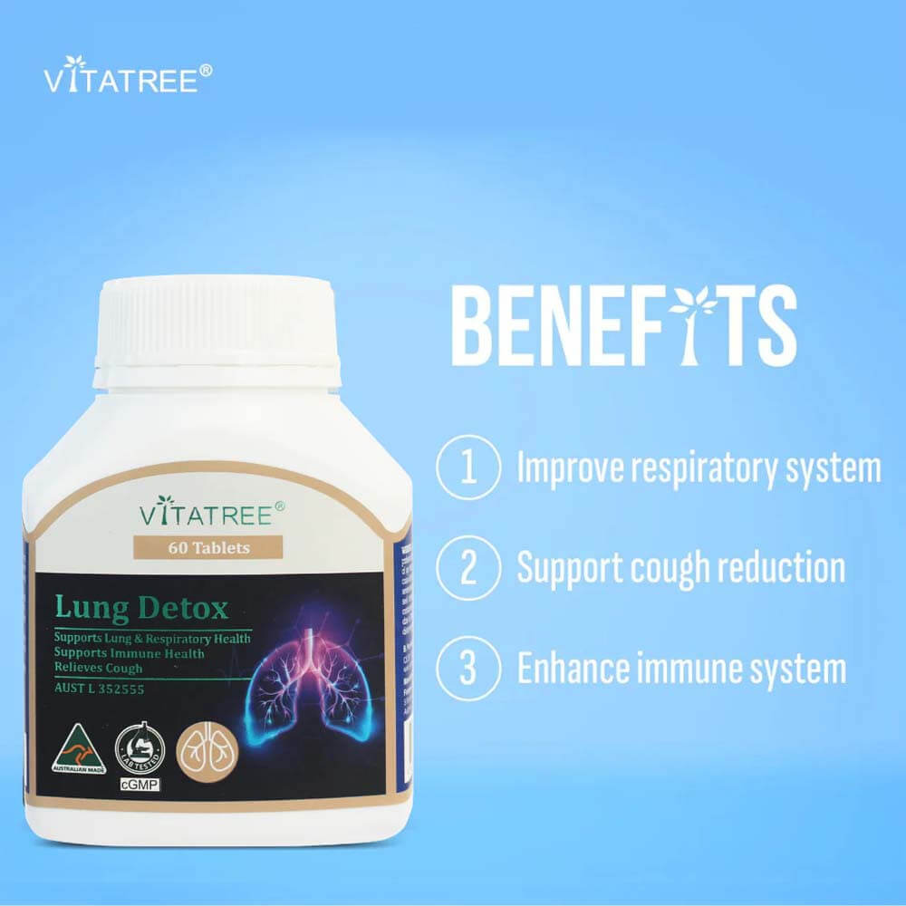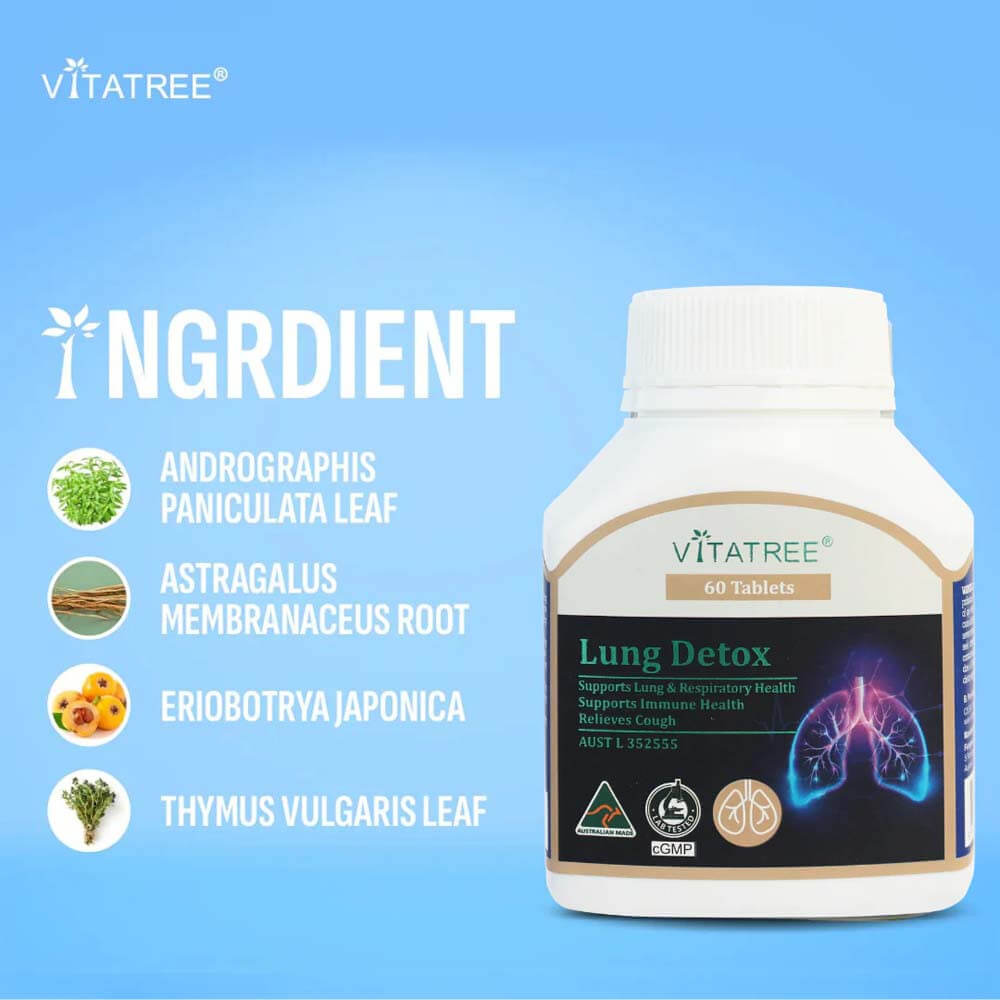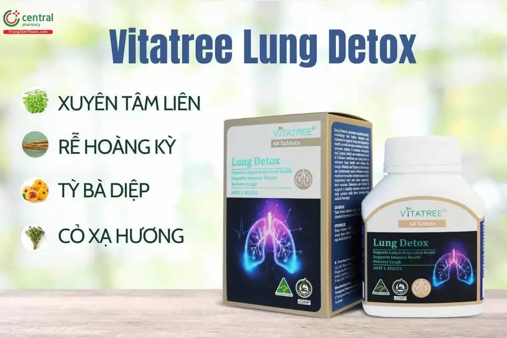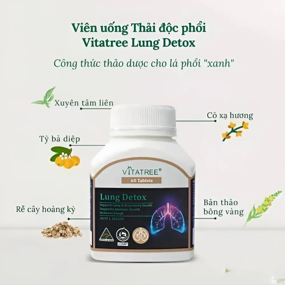 | Tên sản phẩm | Viên uống Vitatree Lung Detox (Hộp 60 viên) – Thảo dược thải độc phổi, hỗ trợ giảm ho của Úc |